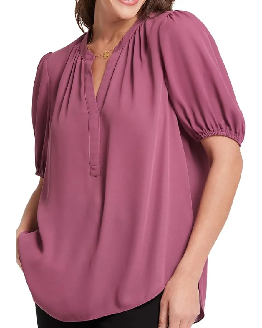 - The NYDJ® Puff Sleeve Popover Top is made from georgette and has an impeccable drape. This blouse has soft, romantic gathers throughout. It features a split V-neckline, short puff sleeves, shoulder gathers, and a high-low hem.