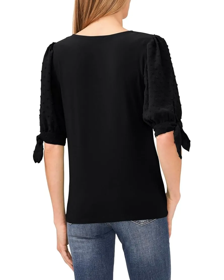 - Puff sleeves and playful ties: The CeCe™ Puff Sleeve Tee With Tie is where effortless chic meets every day fun. This must-have top effortlessly blends textures with its solid crinkle clip dot sleeves and smooth crepe knit body, offering a captivating mix of sophistication and playful charm. Designed with a classic fit and quarter sleeves, it’s perfect for transitioning through seasons with ease. The V-neck adds a flattering touch, while the tie detail at the waist enhances your silhouette.