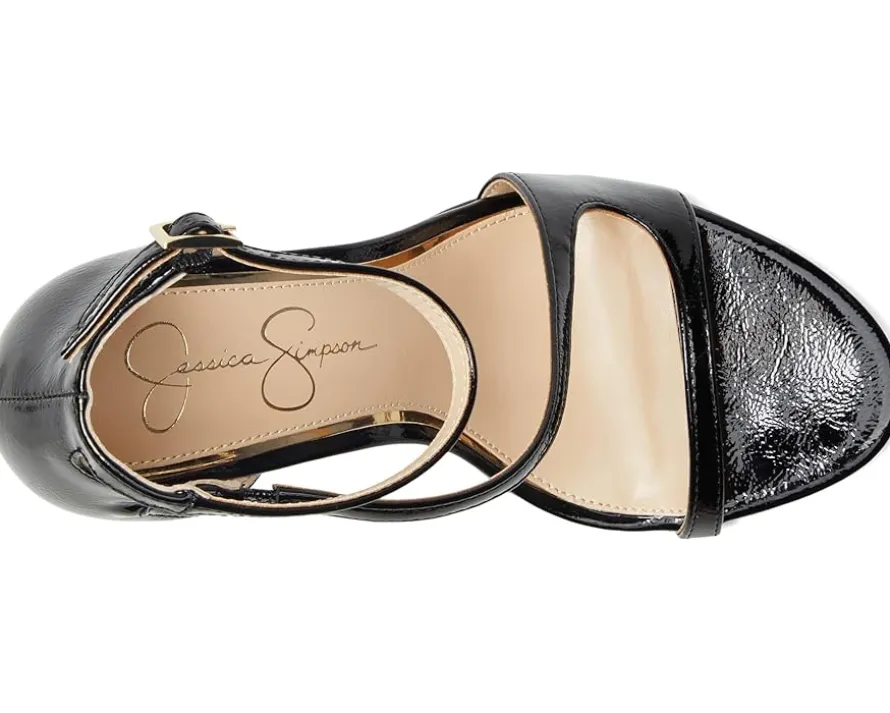 - Styled with an asymmetrical strap design for an eye-catching appeal, make a stylish entry into a party or event wearing the Jessica Simpson™ Qamille Asymmetrical High Heel Sandals. These heeled sandals are made of a cushioned insole and synthetic lining. The crinkle patent synthetic upper has an ankle strap with buckle closure for added support. Whether you’re dressing up for a fashion event or a formal event, these sandals are a great choice.