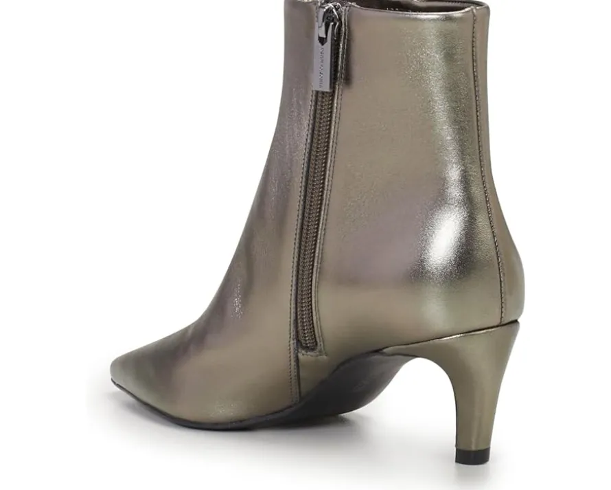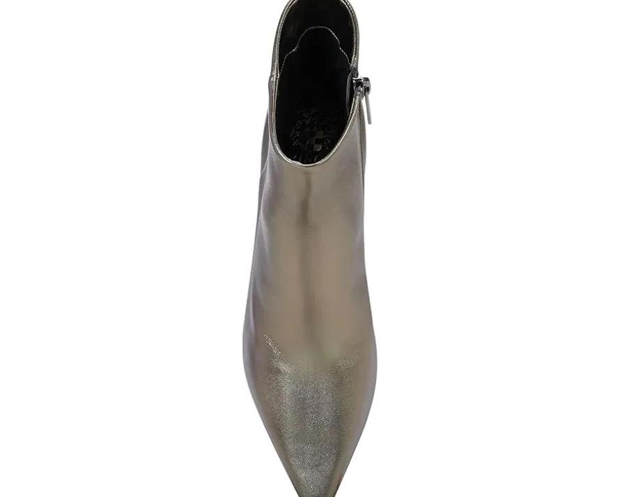 - Crafted from luxe leather upper, the Vince Camuto® Quinley boasts a chic snake print or matte metallic finish. Featuring a pointed toe, padded footbed, and trendy comma stiletto heel, this ankle-high bootie with a side zippered closure effortlessly transitions from denim to dresses, ensuring comfort and flair with every step.