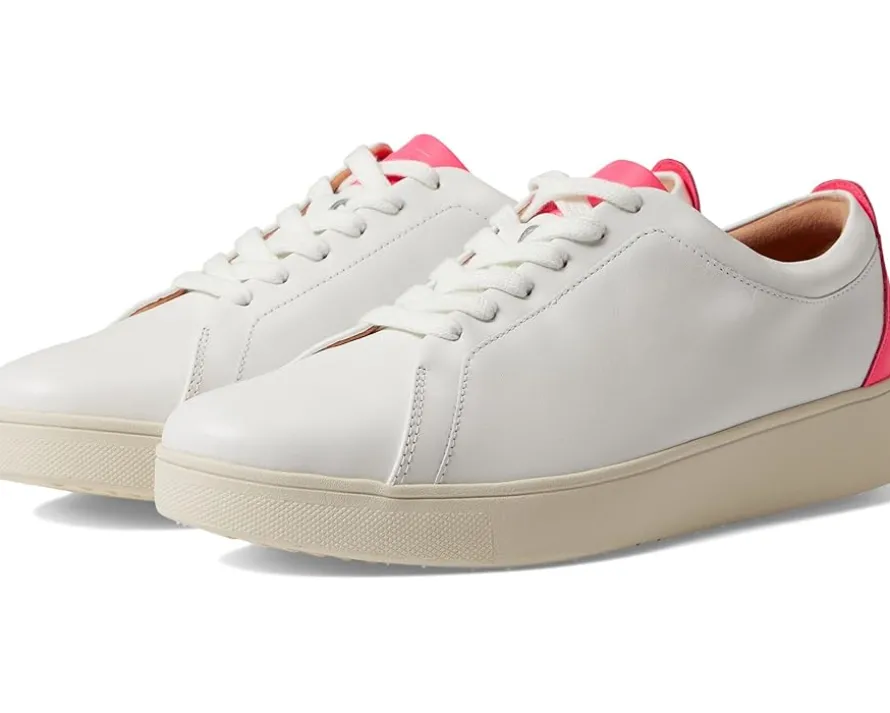 - Step out with elevated style and comfort wearing FitFlop™ Rally Neon-Pop Leather Sneakers.