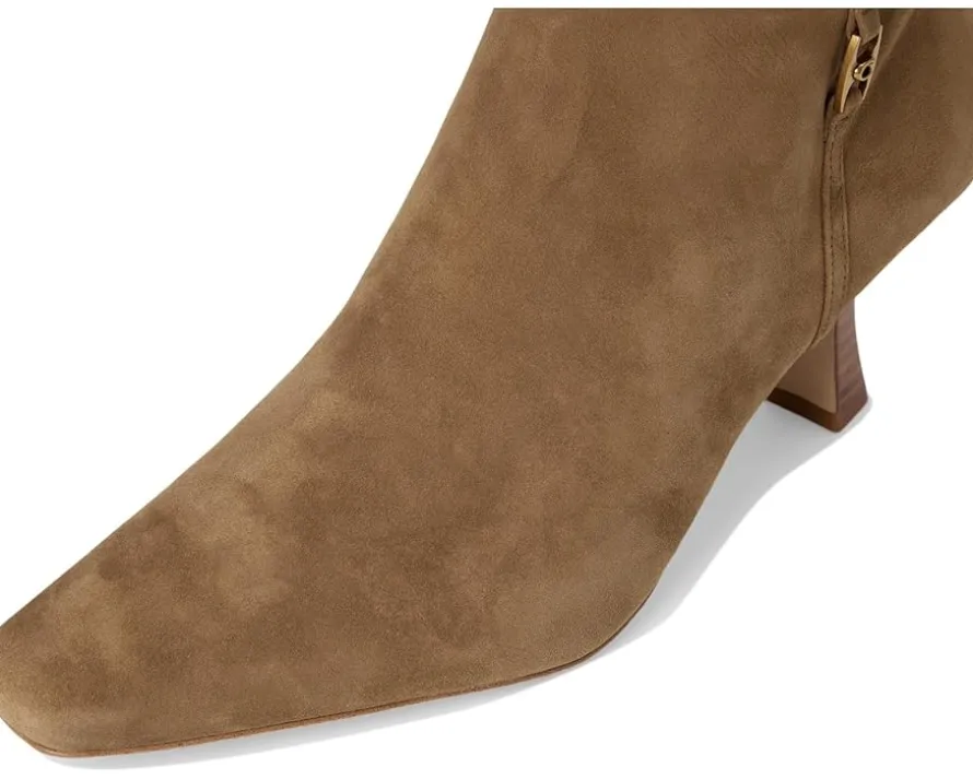 - From the desk to dinner, maintain your effortless style in the COACH® Raquel Suede Boots II. Featuring a side zipper closure in a square toe silhouette with a kitten heel, these boots are crafted from a smooth leather upper, leather and textile lining and a leather insole.