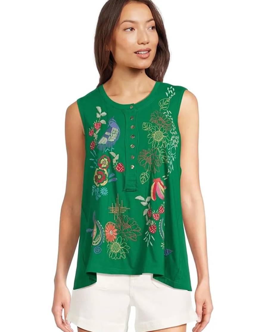 - Bright and cheerful, this sleeveless Henley top is bursting with personality thanks to its colorful floral and whimsical bird embroidery. The button-front detail adds a casual, laid-back feel, while the flowy fit keeps it breezy and flattering. A fun statement piece that pairs effortlessly with denim, shorts, or a skirt for an easy pop of charm.