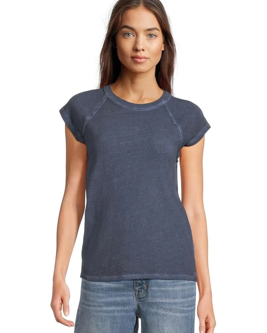 - Free People™ Riley Tee is a forever classic with a contemporary twist. Ideal for the casual days, this slim fit tee boasts a crew neckline, short raglan sleeves, and raw-edge trimming throughout.