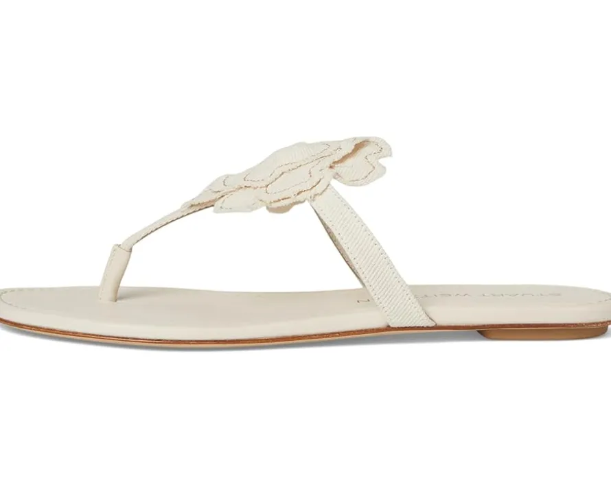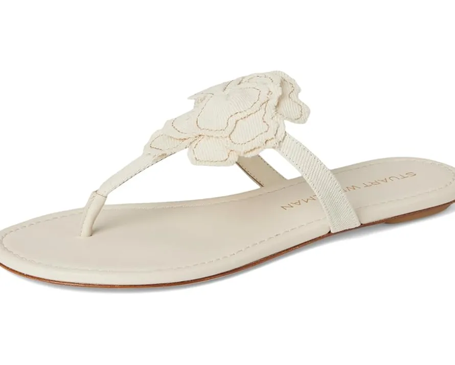 - Sun-kissed glam meets effortless elegance in the iconic Stuart Weitzman® Rio T-strap Sandals! These luxe slip-on sandals bring vacation vibes to your everyday look with their breezy cotton upper and sophisticated leather lining. Designed to keep you chic and comfortable, they feature a sleek T-strap silhouette that elongates the leg and adds a timeless touch to any outfit. The smooth leather insole cradles your feet in soft support, while the leather outsole ensures durable wear and polished finesse.