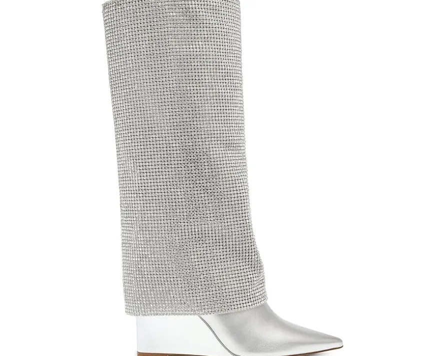 - Carved in a smooth and glossy pointed toe silhouette with foldover rhinestone detailing, the Steve Madden® Riski Boots are sure to add some drama to your look. They are perched on a sleek wedge heel for a chic appeal and come with a zippered interior closure for ease of wear.