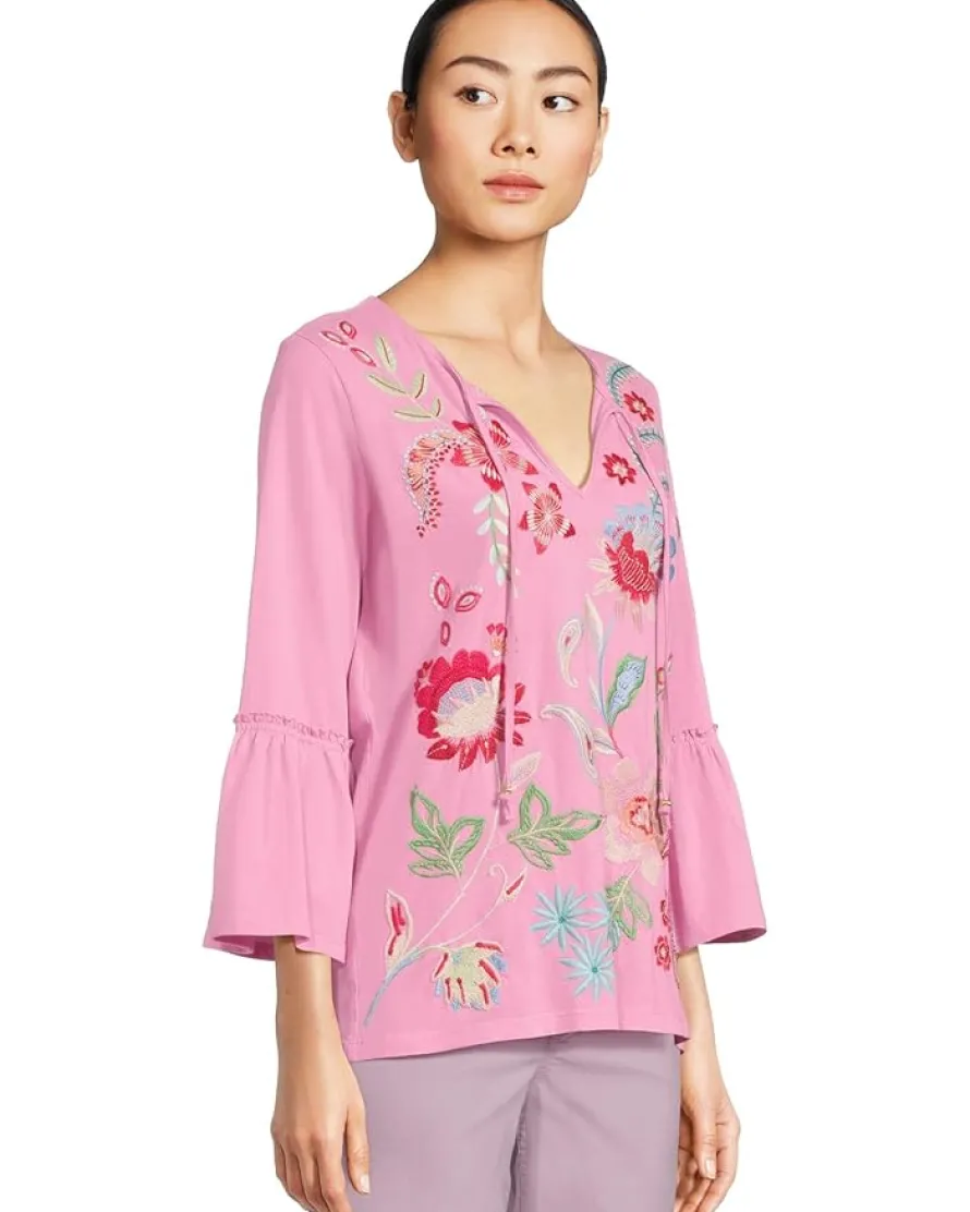 - Crafted for style and breathable comfort, the Johnny Was® Ruffle Sleeve T-shirt is the perfect addition to your casual wardrobe. The pull-on style tee features a V-neckline with tie-up detail, three-fourth ruffle sleeves, a straight hem, and a vibrant embroidery allover for added splash of color.