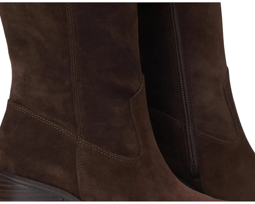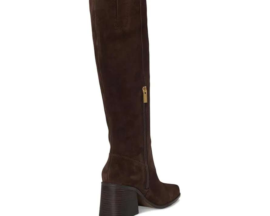- The Vince Camuto® Sangeti Stacked Heel Knee High Boots are tall boots with a wide shaft on stacked, block heels with a slight flare. These heeled boots are designed with a zippered side closure, a padded polyester footbed, and a gore panel along the topline that gives your style comfort. Their leather upper and polyester lining make them comfortable to wear all day. These knee-high boots are a great choice to style up your looks and outfits.