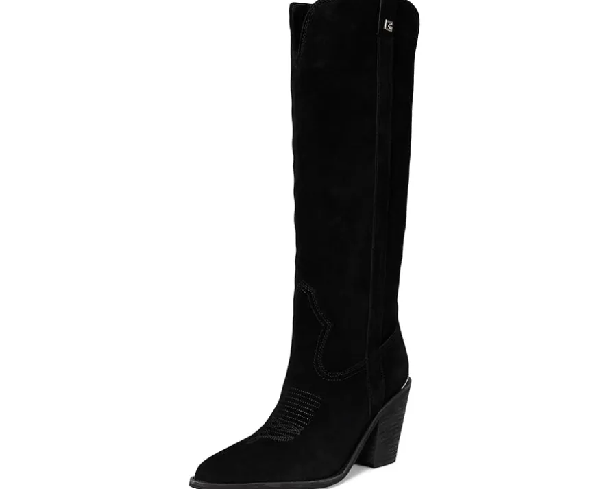 - The Sashan by Guess® offers a curved topline knee-high boot in beautiful suede materials. This stacked heel featuring topline stitching mimics Western flair. Made from soft suede upper, polyurethane lining, padded insole, and rubber outsole.