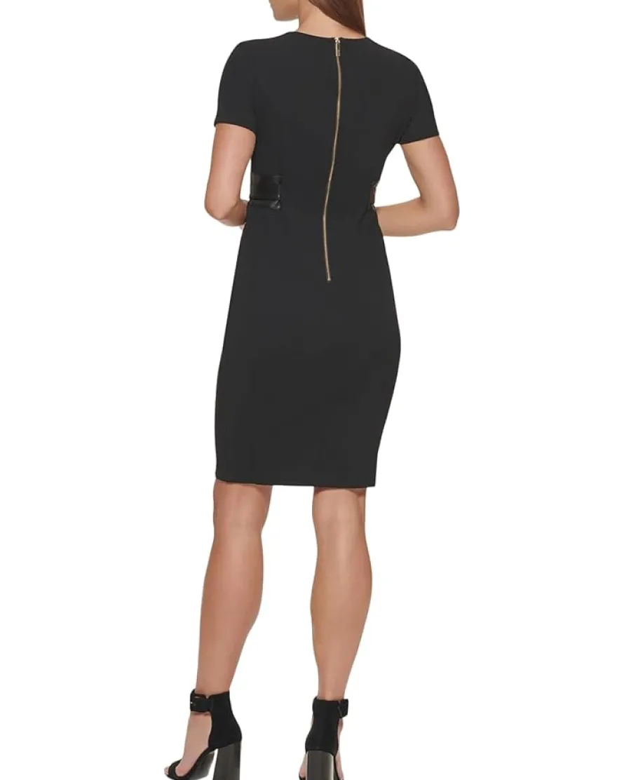 - Featuring a stylish belt tie closure on the front, the Calvin Klein® Scuba Crepe Short Sheath Dress with Faux Leather Belt curates your fashionable look in a unique way. This dress has a short-length silhouette which complements and hugs your body right. The soft fabric construction makes for the comfiest wear.
