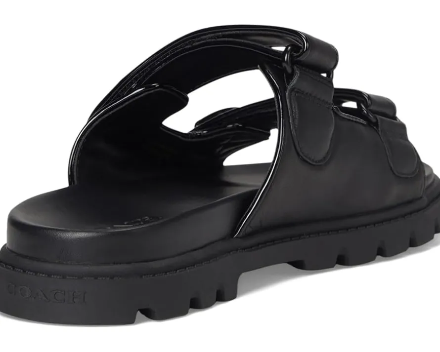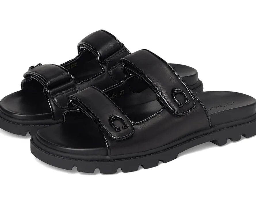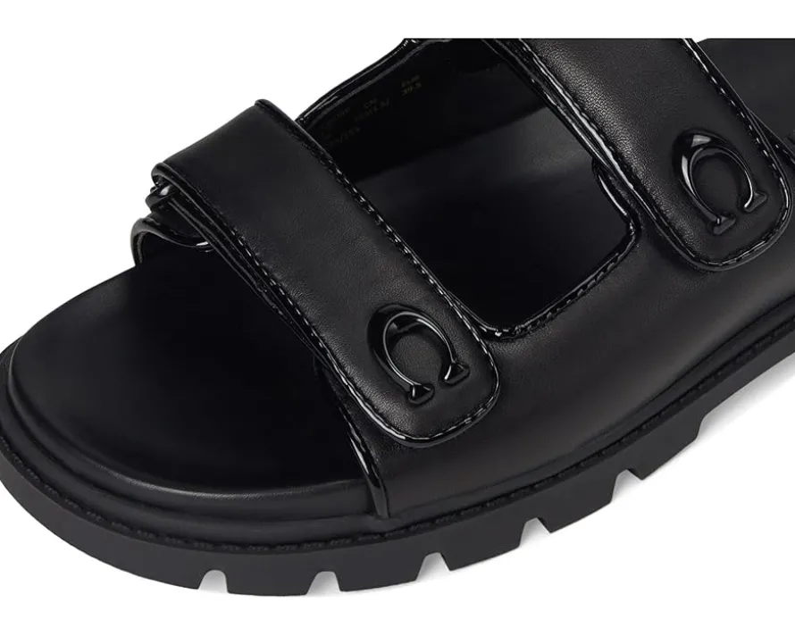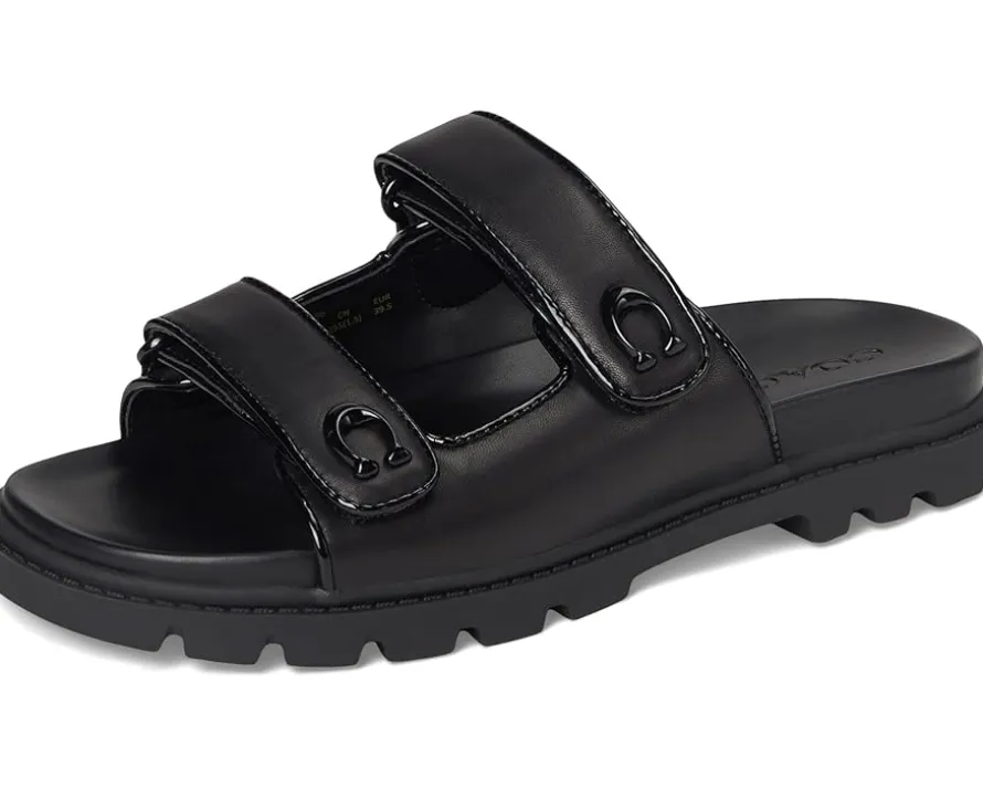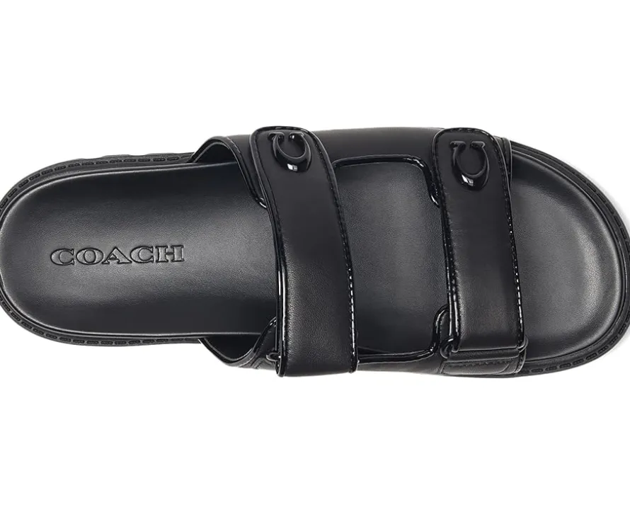 - Whether it’s brunch, beach, or busy streets, these COACH® Sculpted C Leather Double Band Sandals keep you grounded in comfort and grace. Crafted from leather upper, man-made leather lining and footbed, this pair of slip-on sandals features open round toe, two strap detailing with brand logo, and brand detailing on the footbed.