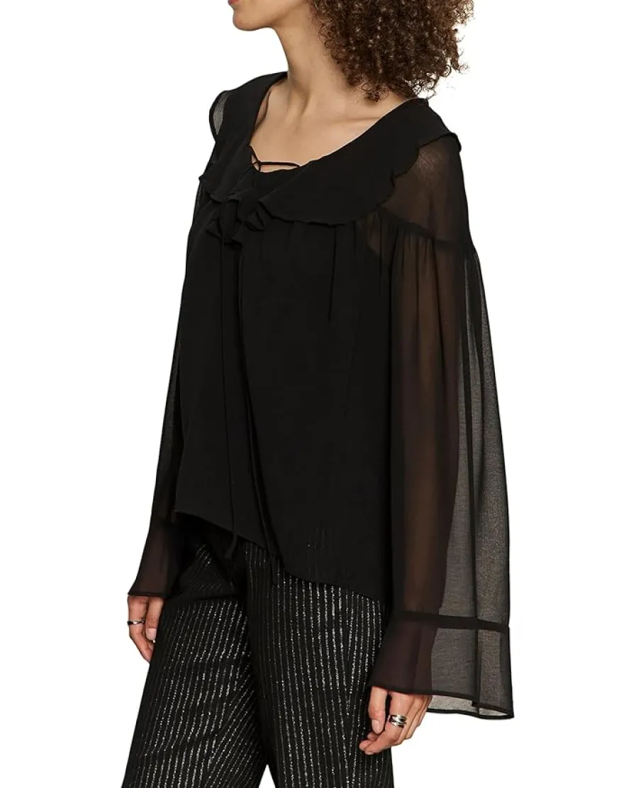 - Exude graceful vibes wearing the Sanctuary™ Secret Lover Blouse. The pull-on style blouse features a V-neckline with tie-up closure, ruffled details, long bell sleeves, and a straight hem.