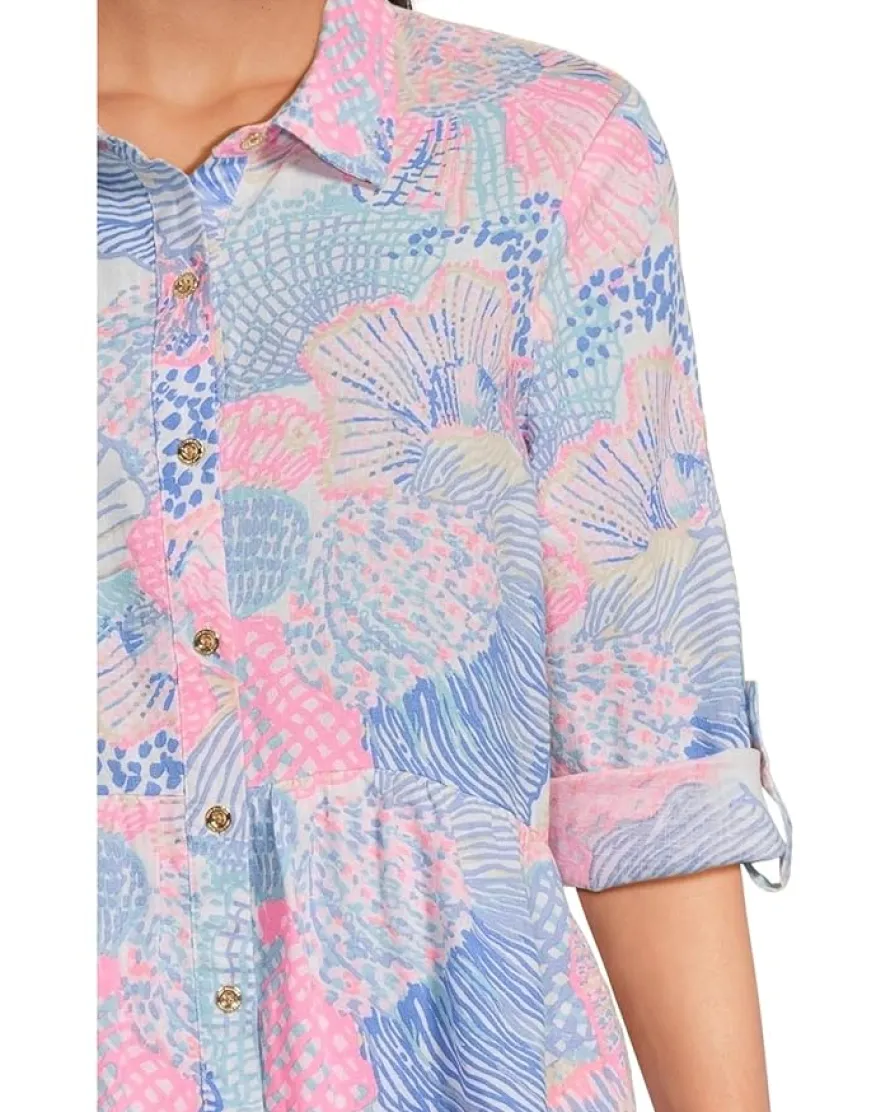 - The Lilly Pulitzer® Shaela Dress is an effortlessly chic piece designed for comfort and style. With an easy, roomier fit that gently skims the body, this above-the-knee dress features three-fourth sleeves with foldable cuffs and a classic collared neckline. The button-front closure adds a polished touch, while the vibrant floral print throughout bring a hint of elegance to this everyday favorite.