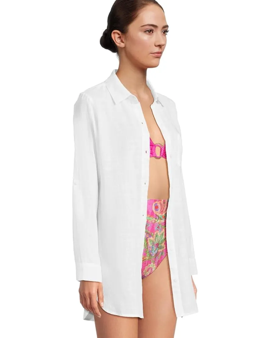 - The Tommy Bahama® Shoreline Cotton Boyfriend Shirt is a great choice to match your casual and formal styles. Its buttoned front closure offers easy wear. Made from cotton fabric that takes your comfort to the next level, this button-down shirt is styled with long sleeves, single cuffs, a collared neckline, and a shirttail hem.