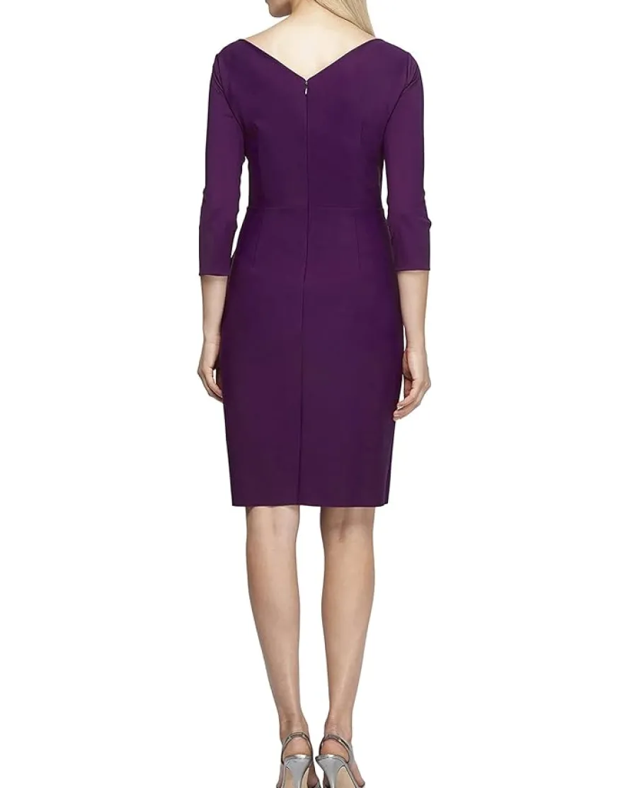 - The Alex Evenings™ Short Scuba Sheath Dress with 3/4 Sleeves will make a lasting impression with a flattering draped waist with a cascading skirt, three-quarter length sleeves, a surplice V-neckline, and an eye-catching beaded side accent.