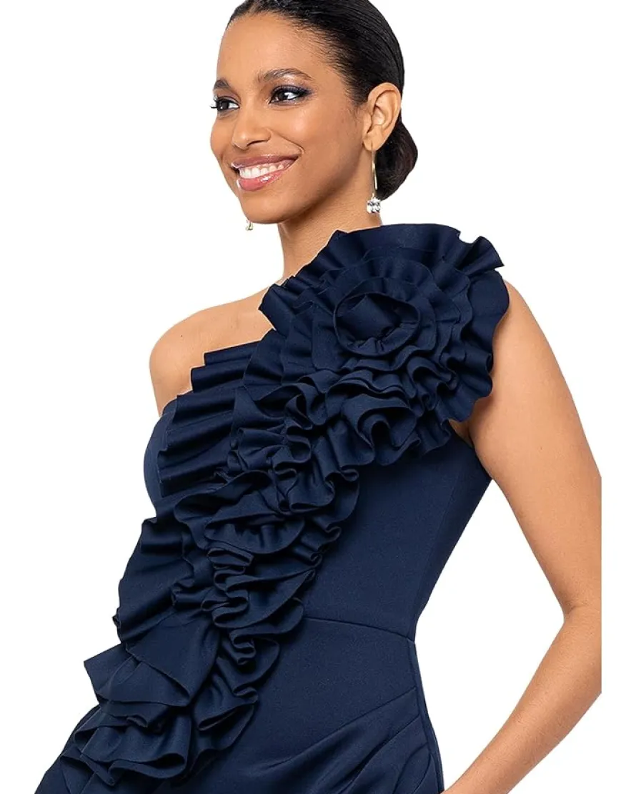 - Asymmetric neckline with 3D flower trim along the shoulder panel.