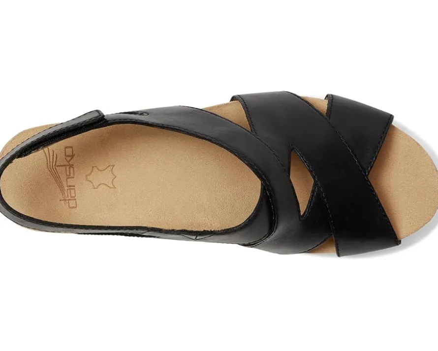 - An intricate asymmetrical strap design adds a splash of style to the Dansko® Shyla, an anytime wedge sandal with all-day comfort. With an adjustable hook-and-loop ankle strap, these sandals feature an upper crafted from high-quality leathers and nubuck treated with 3M Scotchgard for superior stain resistance. In addition, the chrome-free suede socklining ensures breathability, while the cushioned, energy-return PU footbed provides all-day support.
