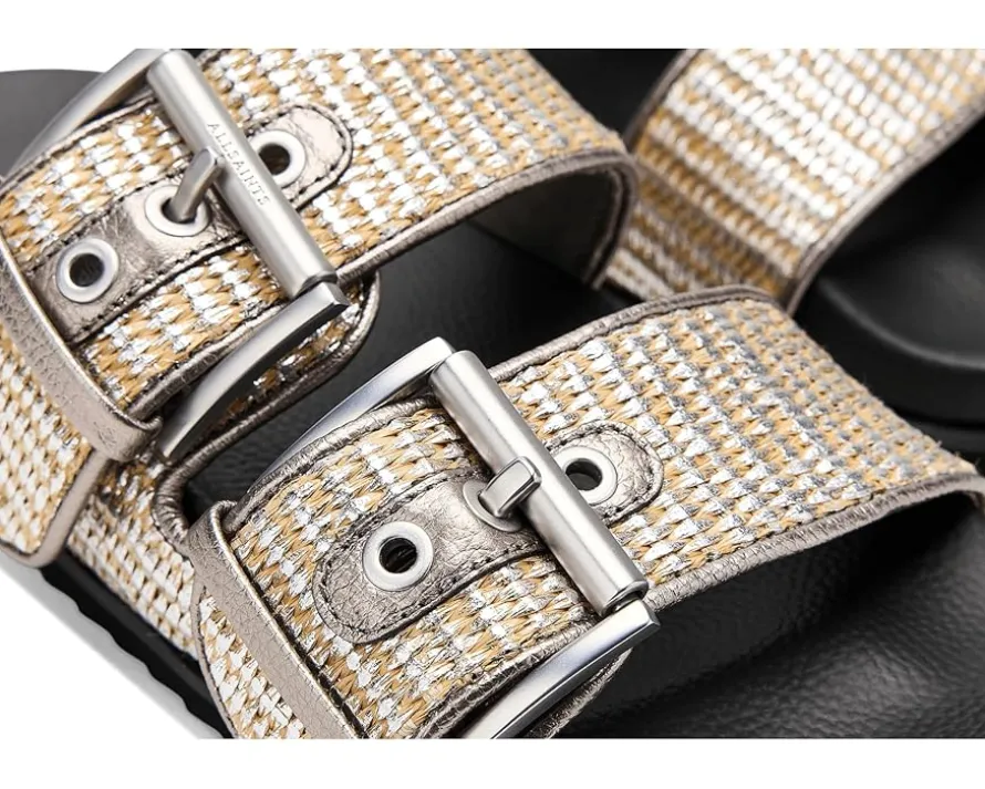 - Sun-kissed vibes meet city-edge chic – the AllSaints™ Sian Raffia Sandals. Slip into effortless cool with a luxe leather upper, lining, and insole that feel just as premium as they look. The laid-back raffia-inspired texture adds coastal flair, while the dual adjustable buckles serve up both function and fashion with a custom fit. Designed with an open toe for breezy comfort and an EVA outsole that delivers lightweight, all-day wearability, these slip-on sandals are your go-to for beach strolls, brunch dates, and beyond.