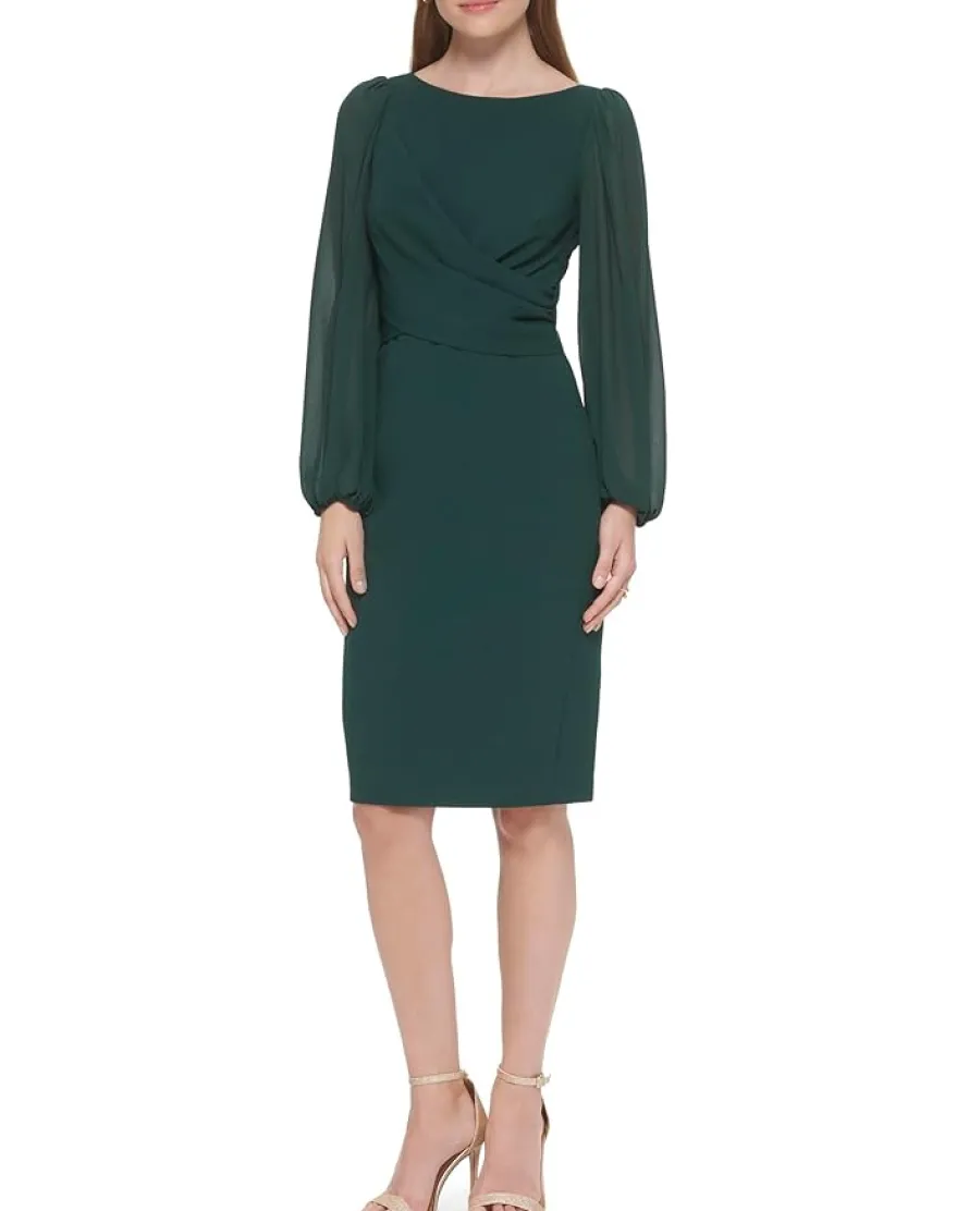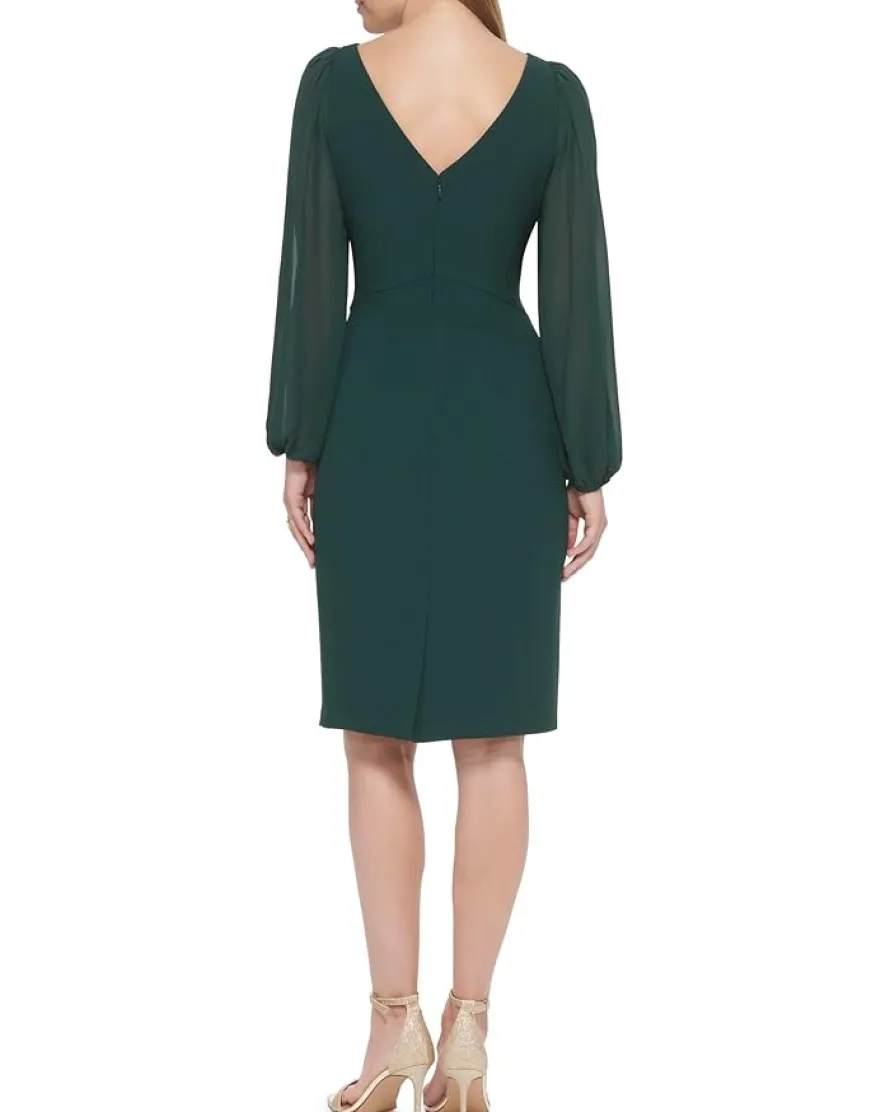 - Ascend the stairway of chic styles and upgrade your look by donning the sleek Vince Camuto® Signature Stretch Crepe Bodycon with Chiffon Balloon Sleeve dress.