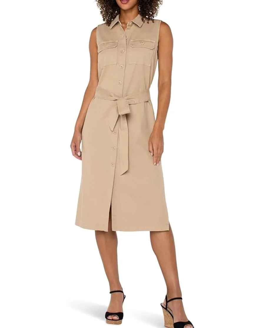 - Elevate your style with the Liverpool™ Los Angeles Sleeveless Shirt Dress With Slits. Featuring a classic collar and a button front closure, it combines timeless details with a modern fit. Made from a lightweight, textured, stretch-woven fabric, this button-down dress is styled with a collared neckline and a straight hem. The tie closure at the waist offers a flattering fit. Timeless, easygoing, and always flattering, this sleeveless dress will be your ultimate go-to dress.