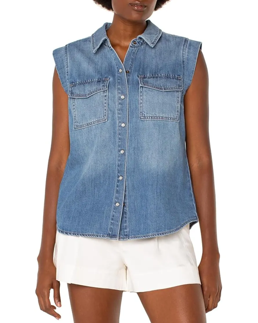 - Give your fashion game a chic update wearing the Liverpool™ Los Angeles Sleeveless Shirt With Pockets. It is designed with pearlescent buttons that add a touch of elegance. The chest patch pockets not only enhance its functionality but also contribute to its laid-back charm.