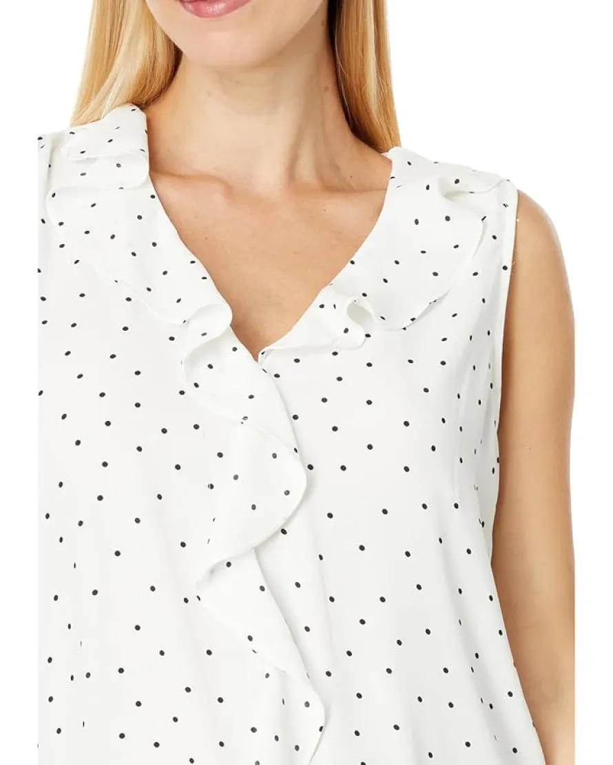 - Look cute and classic wearing the Vince Camuto® Sleeveless V-Neck Ruffle Front Pindot Blouse.