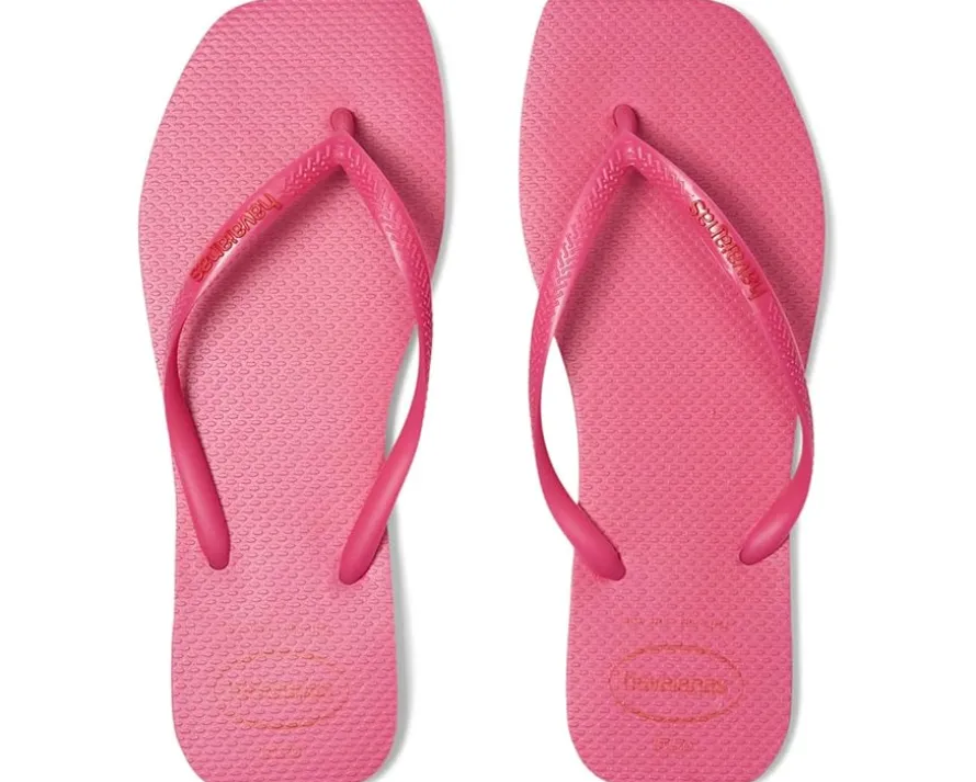 - The Havaianas® Slim Square Logo Pop Up Sandals are designed in a thong style with an easy slip-on design. This open squared-toe sandal features a rubber upper with the iconic Havaianas® logo in a contrasting color and prominently displayed on the strap. It also comes with a rubber lining and insole.
