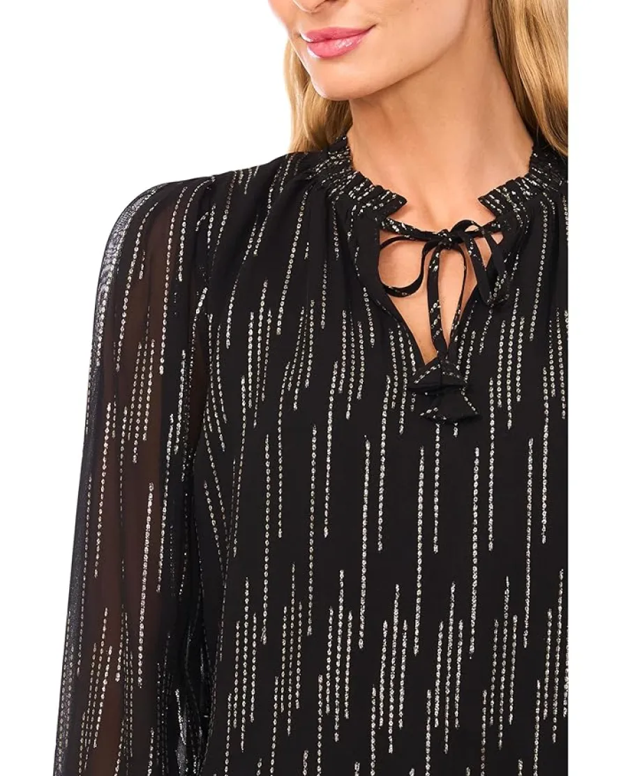 - Chic and classic, the CeCe™ Smocked Cuff Ruffle Tie Neck Top is the perfect piece to take you from season to season. This body lined lurex clip chiffon blouse features a tie neckline and long sleeves with smocked cuffs for a feminine flair. Stunning fabric with allover gold detailing adds style and a relaxed fit offers all-day comfort. It is versatile enough to be worn for the office or night out with friends.
