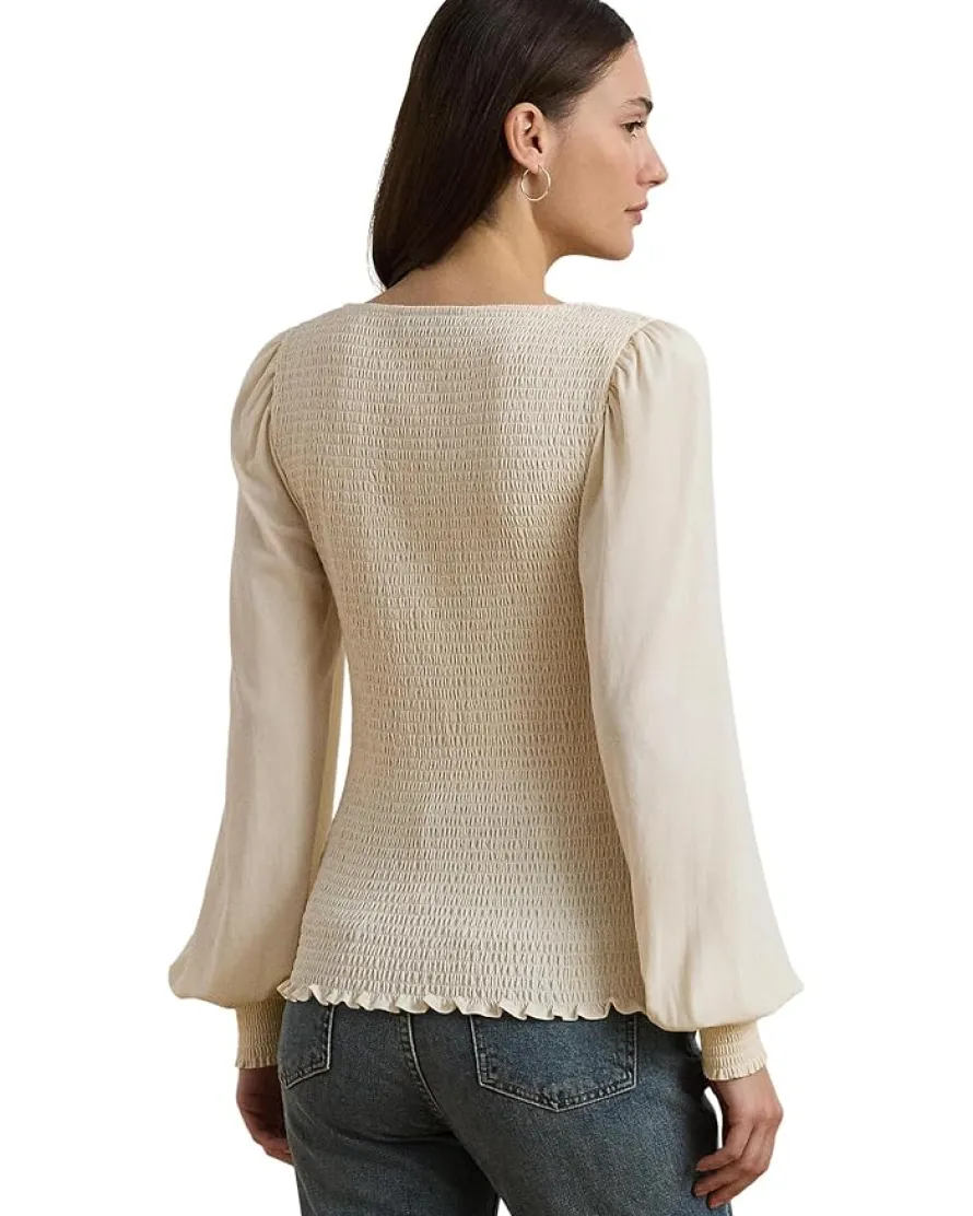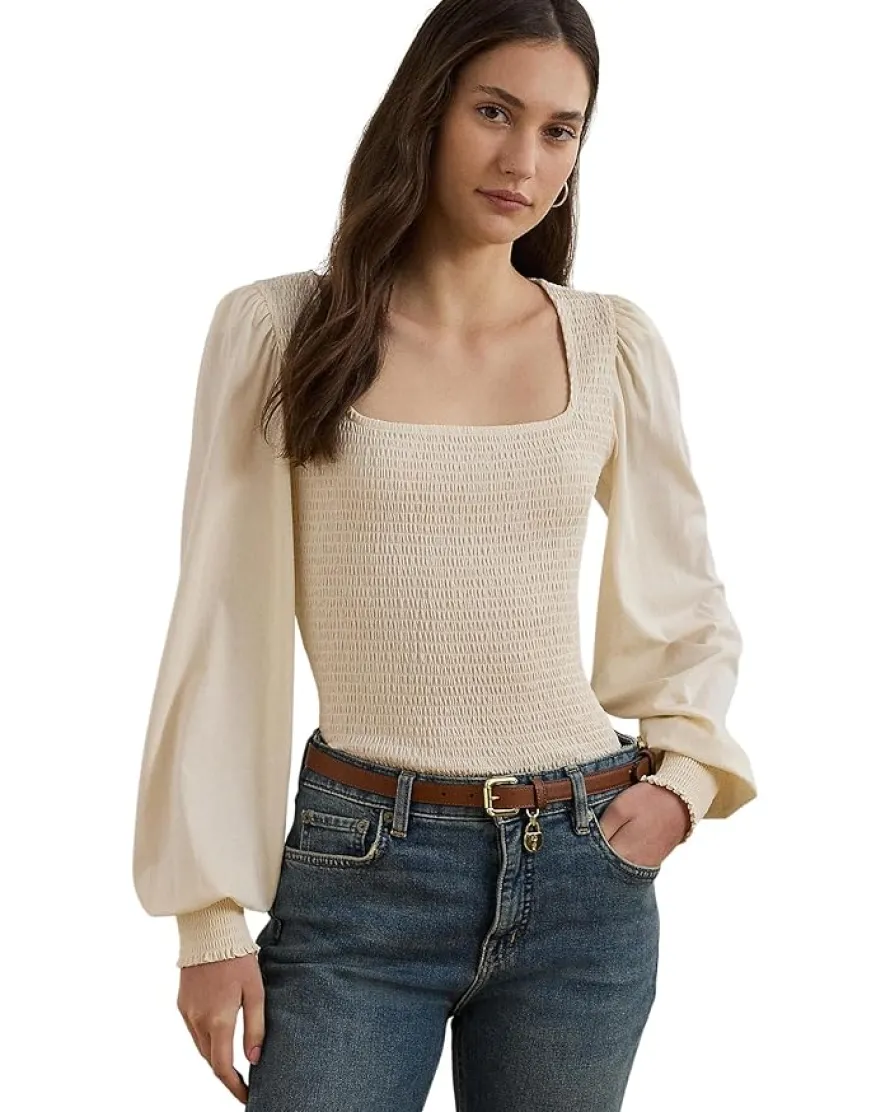 - Crafted with breathable jersey, the LAUREN Ralph Lauren® Smocked Jersey Blouson Sleeve Top captures the spirit of romance with a smocked bodice and voluminous blouson sleeves.
