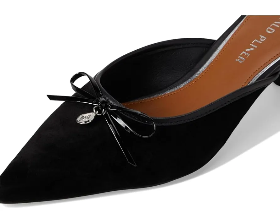 - Discover the Donald Pliner® Soel, where timeless style meets contemporary charm. Crafted from plush black suede, this pointed-toe silhouette features a refined bow detail and sleek tonal trim that effortlessly blends classic charm with contemporary flair. The soft leather upper, lining, and insole offer a luxe feel with every step, while the sculpted kitten heel delivers a flattering lift without sacrificing comfort. Slip-on ease and a Toeflex outsole provide flexible support for day-to-night wearability.