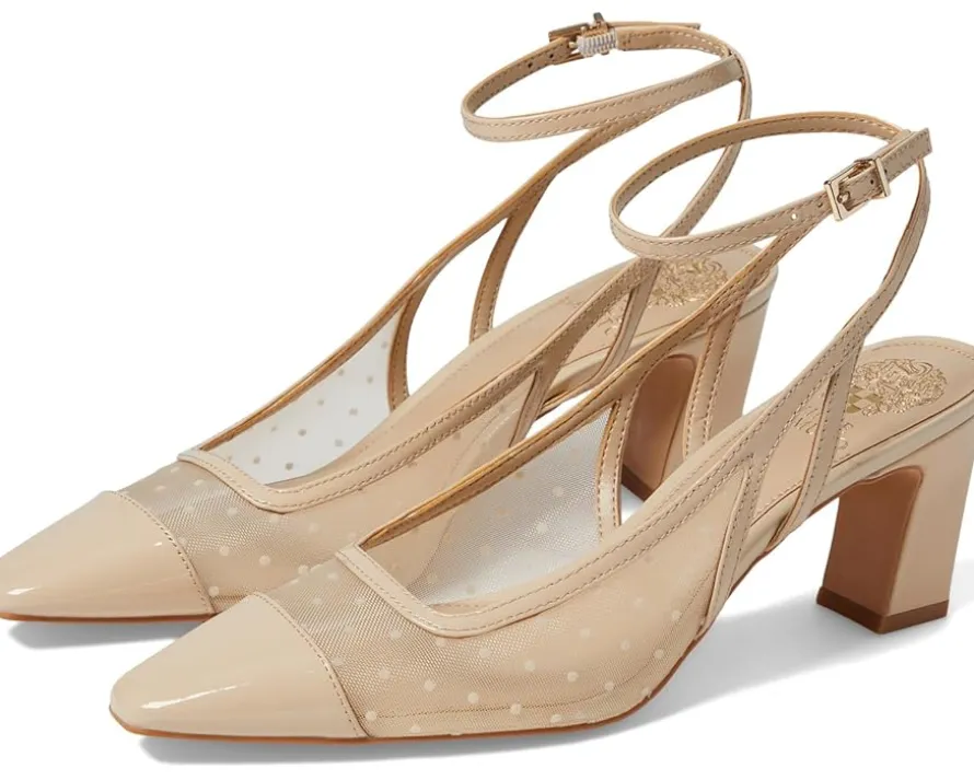 - Elevate your ensemble with a nod to vintage elegance in Vince Camuto® Somlee pumps. These slingback pumps feature an adjustable ankle wrap strap, seamlessly blending old-world charm with contemporary flair. The design boasts a trendy square cap toe crafted from soft patent leather, while the upper is complemented by a unique combination of leather strapping and mesh panels adorned with pin dot details. The sturdy block-shaped, mid-height heel ensures comfort for all-day wear