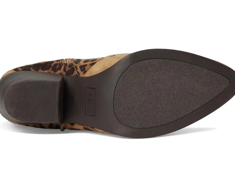 - Unleash your wild side styling MIA™ Sonni. These statement boots flaunt a fun animal print crafted on vegan faux suede, pairing cruelty-free fashion with head-turning flair. The faux leather lining and plush MIA Signature Footbed™ ensure all-day comfort, while the foam insole cushions every step. A convenient side zipper makes slipping them on a breeze, and the mid-calf height with a sturdy block heel offers both confidence and stability. With a rounded toe for timeless appeal and a durable synthetic rubber outsole, these boots are as practical as they are playful.
