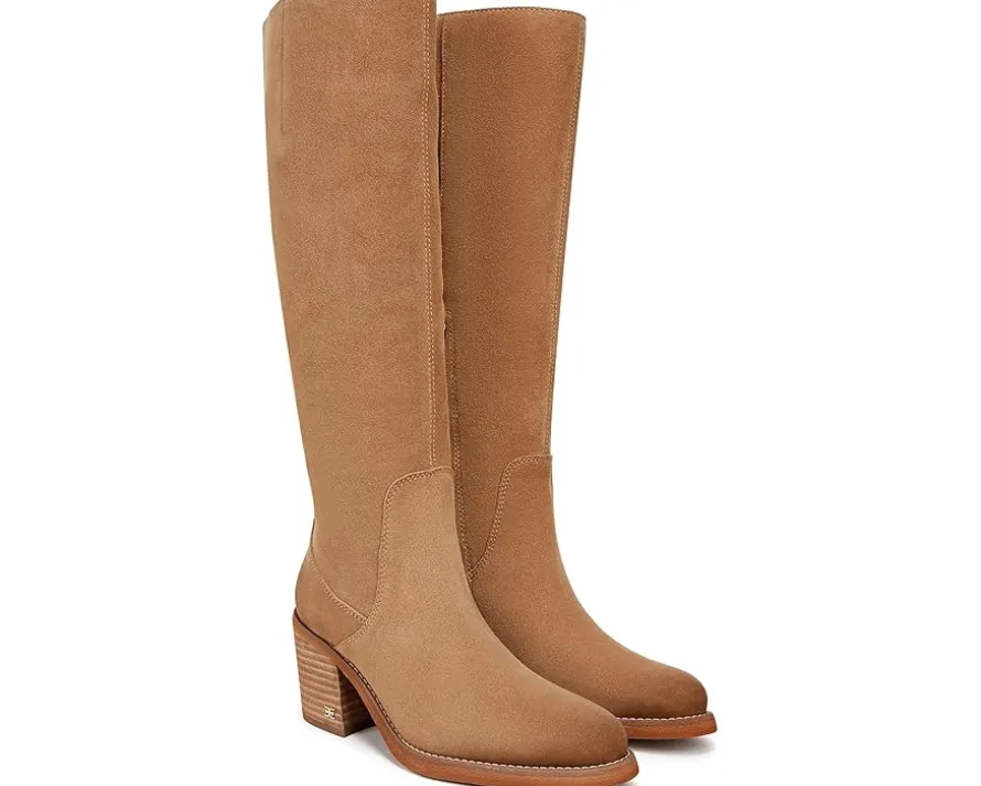 - Biker vibes meets city chic with the Sam Edelman® Soyer, a polished tall knee-high boot featuring almond toe and chunky block heel. The pull-on footwear has leather upper construction with polyurethane lining and insole for all-day comfort.