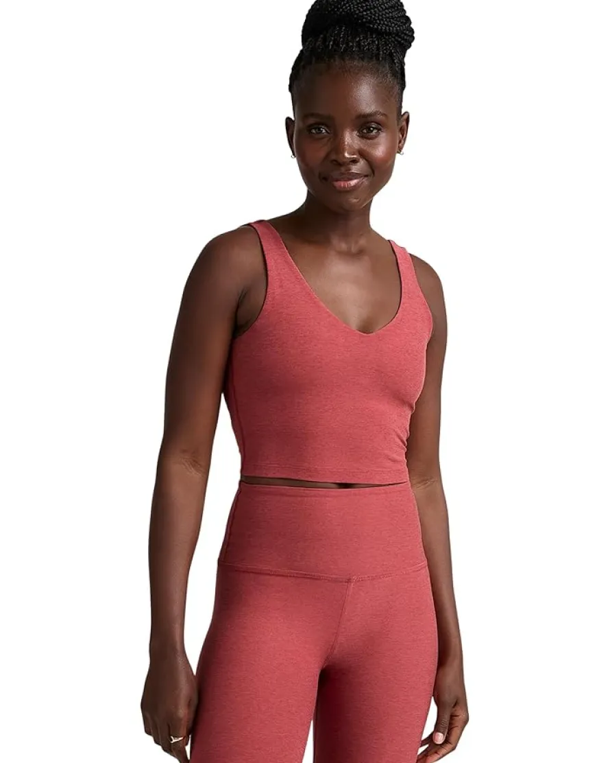 - Start your day in style wearing the Beyond Yoga® Spacedye Good Day Cropped Tank-where comfort meets versatility. Featuring a flattering front and back V-neckline, this tank offers a sleek, fitted look with medium support from its self shelf bra. The cropped length and sleeveless design make it perfect for workouts or casual hangouts. Made from ultra-soft Spacedye fabric, it’s your go-to for both active moments and relaxed days.
