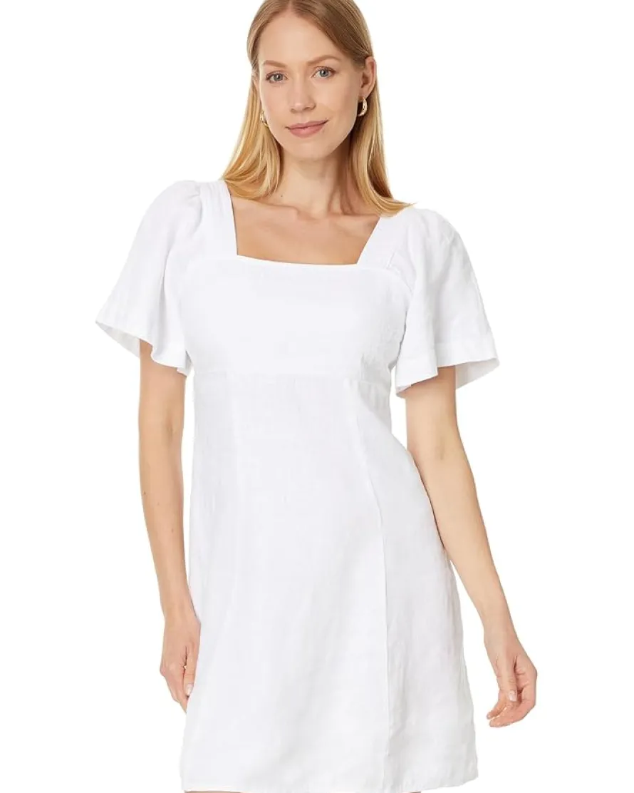 - Set into the symphony of glamorous charm wearing Madewell® Square-Neck Mini Dress in 100% Linen. It features a square neckline, short sleeves, and wide elasticized band at the back with buttoned accent and cutout detail.