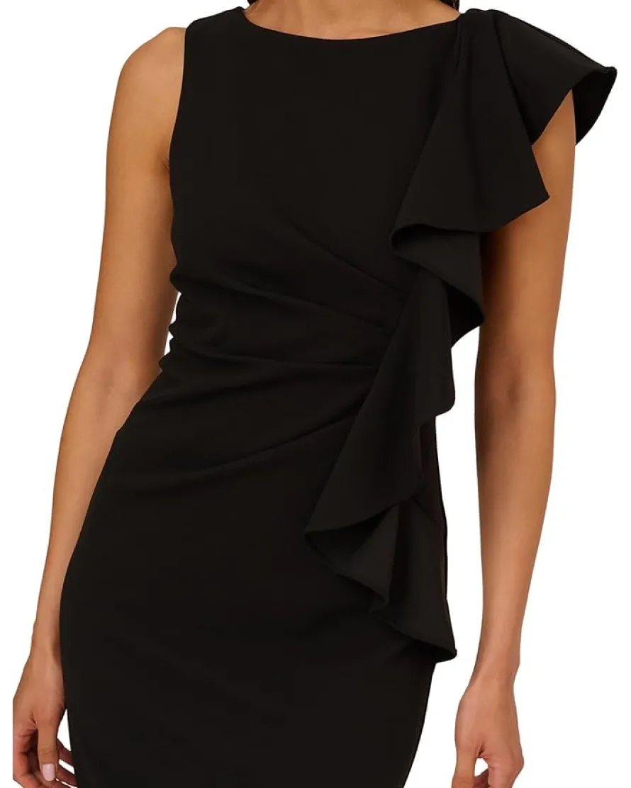 - Exude ethereal elegance in this breathtaking Adrianna Papell® Stretch Crepe Side Ruffle Cocktail Dress made out of a knit crepe fabric, showcasing shirring along waist with ruffle detailing on the left. This is a knee-length sheath dress with a boat neckline in the front and v-neck neckline in the back.