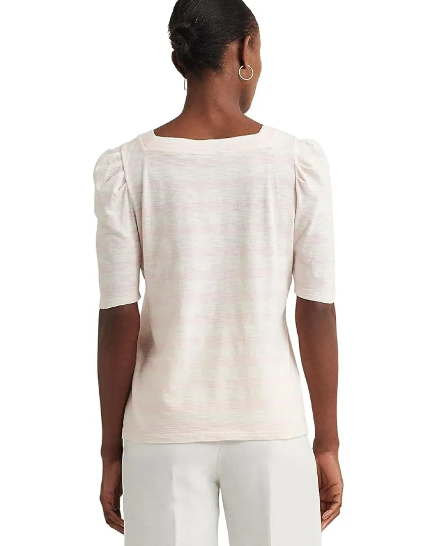 - Elevate your casual look with the LAUREN Ralph Lauren® Striped Cotton Jersey Puff-Sleeve Tee. Crafted with a square neckline, this tee exudes contemporary charm. Its puffed elbow-length sleeves with pleating detail add a touch of sophistication. Adorned with yarn-dyed stripes, it offers a timeless yet trendy appeal.
