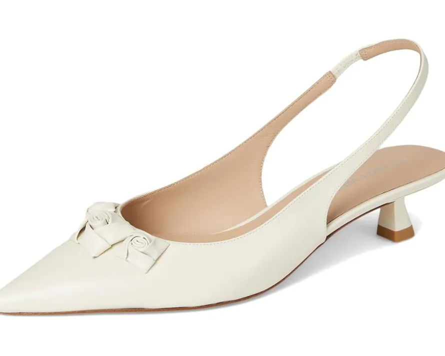 - The Stuart Weitzman® STRT ROSIE SLNGBK 35 is a gored slingback pump, designed to add elegance and style to any outfit. This pull-on footwear features a delicate kitten heel and a classic pointed toe shape. The rose details add a touch of aesthetic charm.