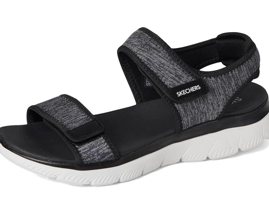 - The SKECHERS® Summits – Cutest Icon are ready for anything, from errands to explorations. This trendy sandal combines laid-back beach vibes with modern flair, featuring a leather upper and lining for a sleek, elevated look. Designed with a Yoga Foam cushioned footbed, it offers cloud-like comfort with every step. The flexible traction rubber outsole ensures stable footing, while the hook-and-loop closure and adjustable double strap slingback provide a custom, secure fit. Open-toe design lets your feet breathe, making it perfect for sunny days. Crafted with vegan materials, it’s the eco-friendly choice for fashion-forward comfort.