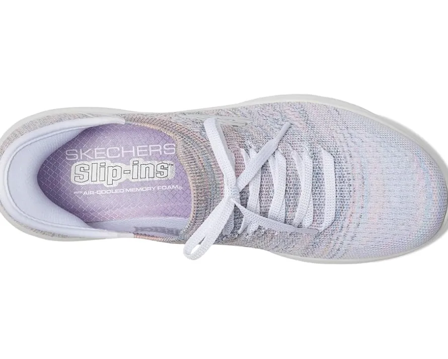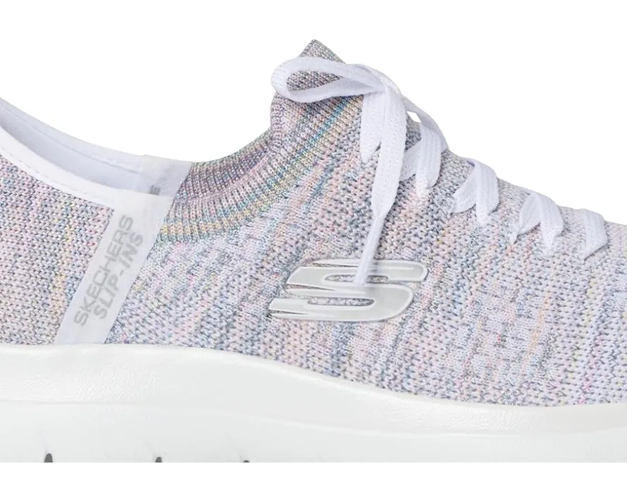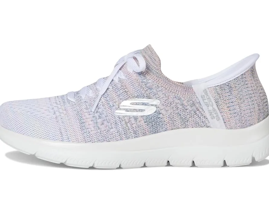 - Introducing the SKECHERS® Summits Hands Free Slip-INS! Say goodbye to fumbling with laces thanks to the fixed stretch laces on these slip-ons. The soft heathered jersey knit upper and Skechers Air-Cooled Memory Foam® cushioned comfort insole will keep your feet happy all day long. With Skechers Hands Free Slip-ins® for an easy fit and the exclusive Heel Pillow™ to securely hold your foot in place, these slip-ons are as comfortable as they are convenient. Plus, the lightweight flexible shock-absorbing midsole provides all-day support for your feet.