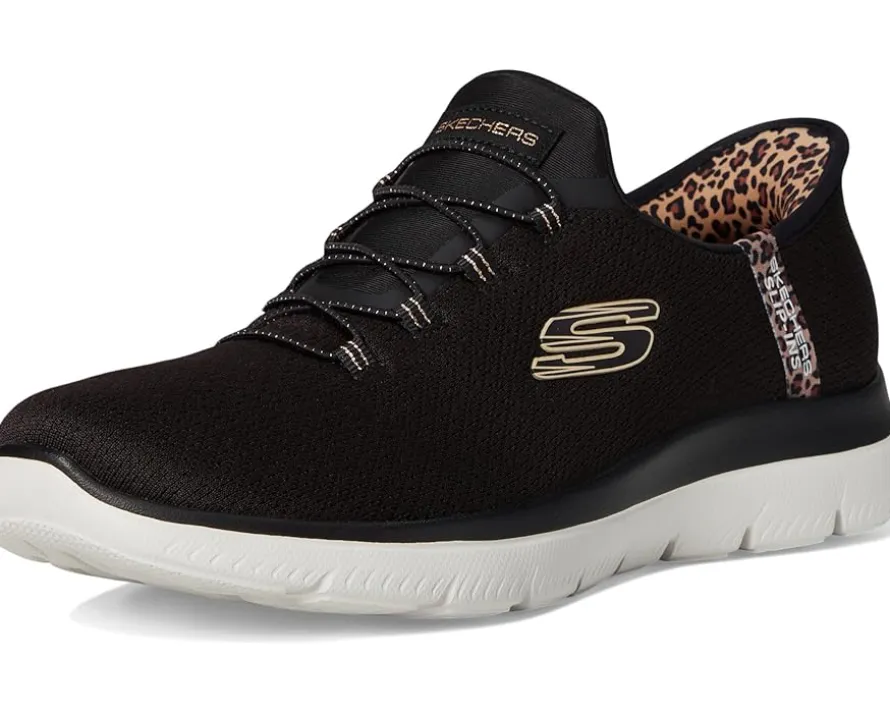 - Step into effortless style donning the SKECHERS® Summits Leopard Chic Hands Free Slip-INS! With their bold leopard print and hands-free design, these slip-ons blend comfort and trend effortlessly. Featuring a rubber upper, insole, and outsole, they’re durable and flexible, while the mesh bungee design allows for easy on and off. The unlined construction enhances breathability, keeping your feet cool all day. Plus, these eco-friendly shoes are vegan, so you can feel good about your choice. Equipped with Air-Cooled MF® technology and a Heel Pillow™, your feet will enjoy all-day cushioning and support.