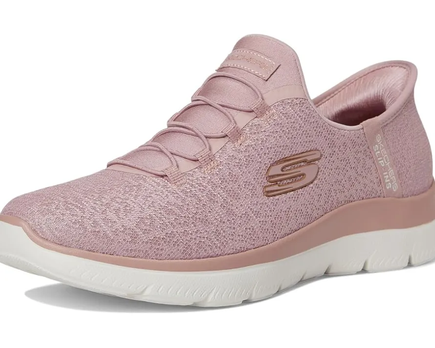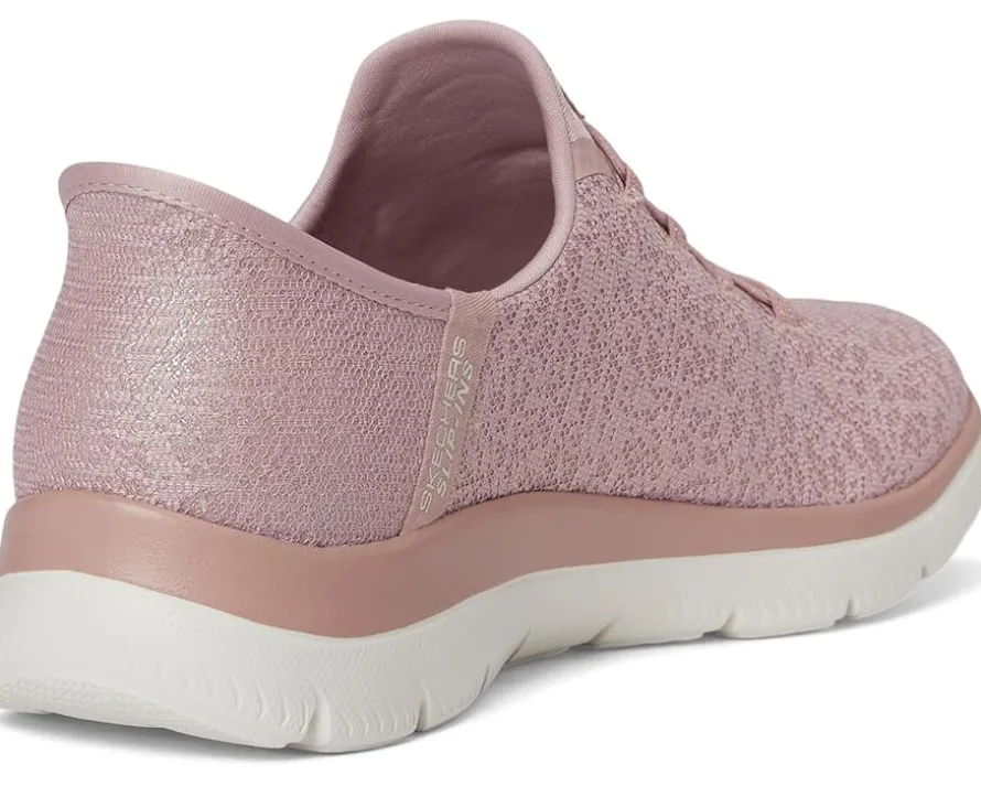 - Add some shimmer to every step wearing the SKECHERS® Summits-Lunar Glow Hands Free Slip-Ins shoes. Designed with an exclusive Heel Pillow™ that holds your foot securely in place, these slip-on shoes feature an iridescent mesh upper with fixed stretch laces and a cushioned Skechers Air-Cooled Memory Foam® comfort insole. Their lightweight, flexible, and shock-absorbing midsole offers all-day comfort and support. Machine washable, these lace-up sneakers are styled with a Skechers® logo detail, Skechers Hands Free Slip-ins® design for an easy fit, and No Tie Fit™ laces that never come untied.