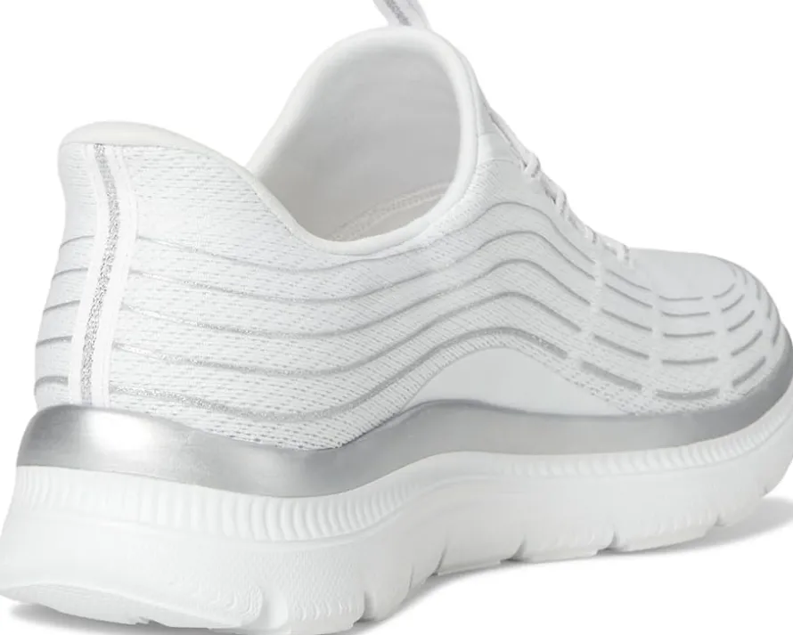 - The SKECHERS® Summits Plus Hands Free Slip-INS provide all-day comfort and style, thanks to the Skechers Air-Cooled Memory Foam® cushioned comfort insole and lightweight, flexible shock-absorbing midsole. Featuring breathable mesh upper with an ombré 3D print and a stretchable lace front, these sneakers offer both style and functionality. The Exclusive Heel Pillow™ keeps your foot securely in place while the Skechers Hands Free Slip-ins® provide an easy fit.
