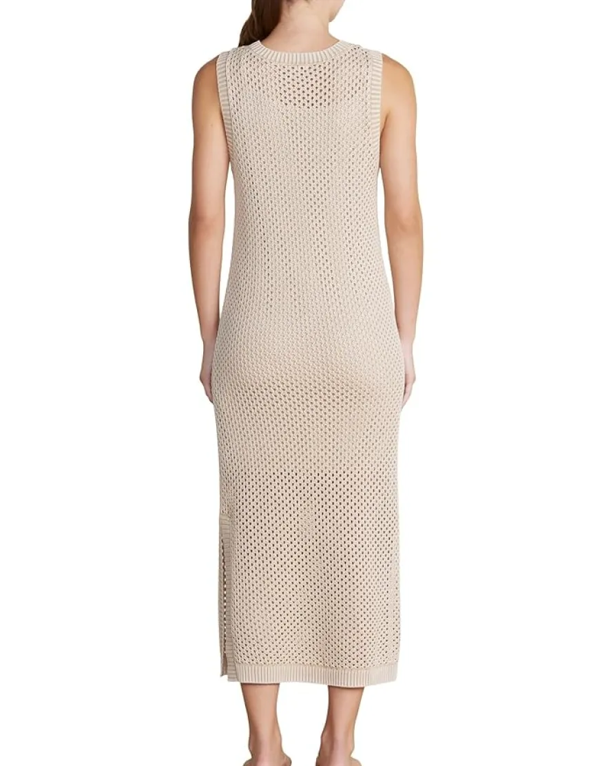 - The Barefoot Dreams® Sunbleached Beach Dress is crafted from durable cotton fabric that takes your comfort to the next level. The open-knit stitching details all over offer style and breathability. This knit dress comes in a sunbleached wash and is garment dyed to offer a hi-low color effect. The semi-fitted tank design provides a chic look while the sleeveless design and crew neckline add to its comfort.