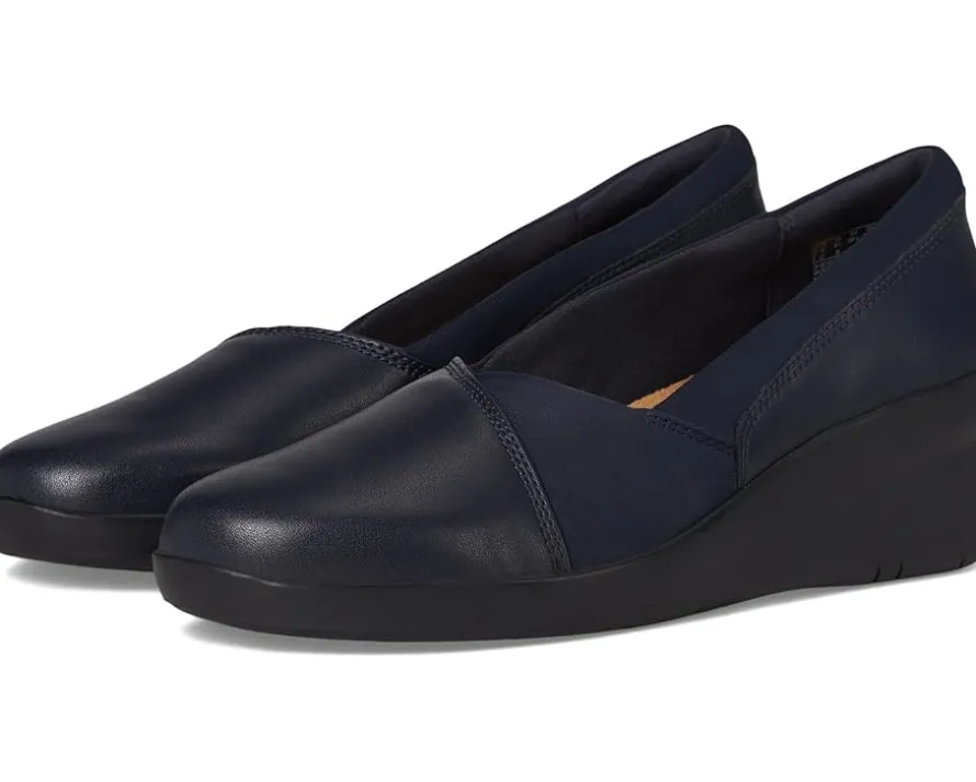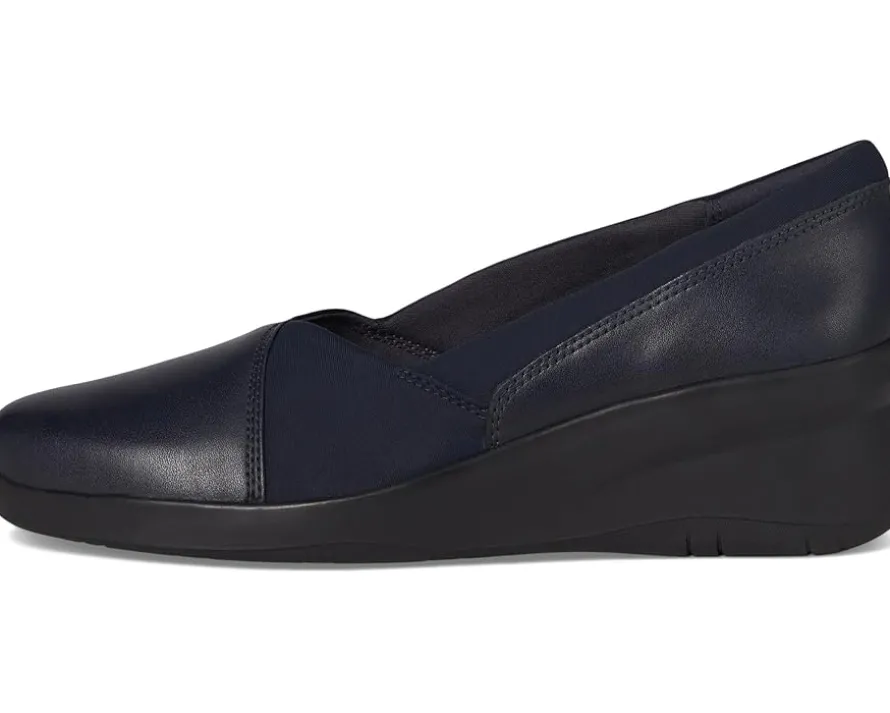 - Perfect for all events, the Clarks™ Suttyn Walk Shoes add both style and comfort to your feet. These slip-on style shoes feature a leather upper with a plain toe shape, mesh lining, and a cushioned leather insole. The wedge heel detail adds style to the look.