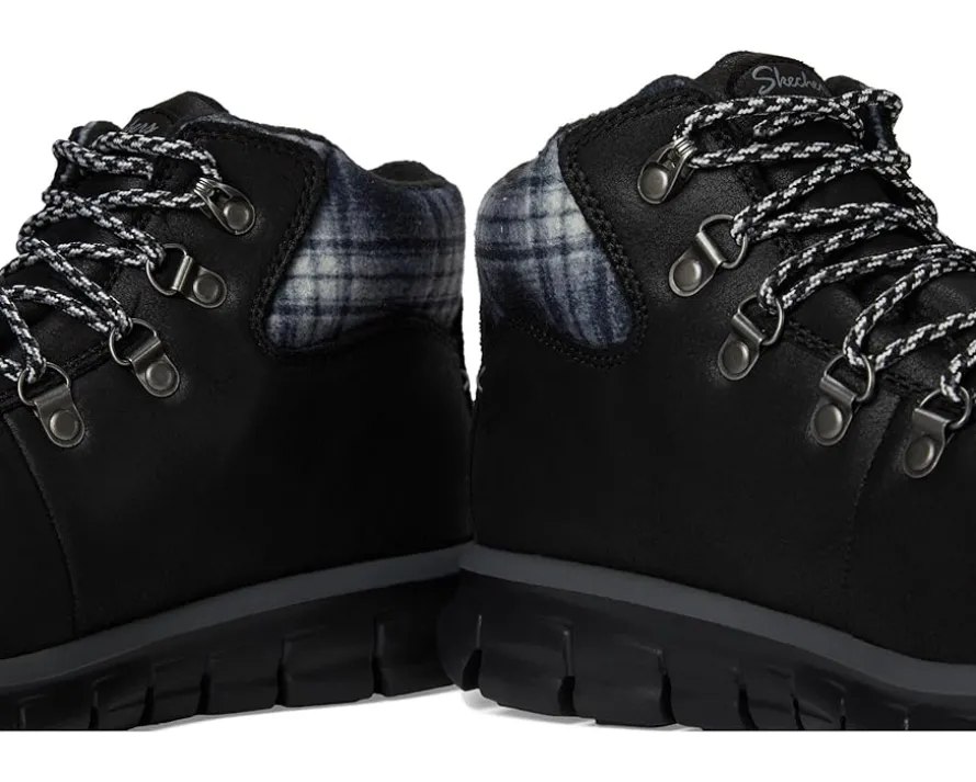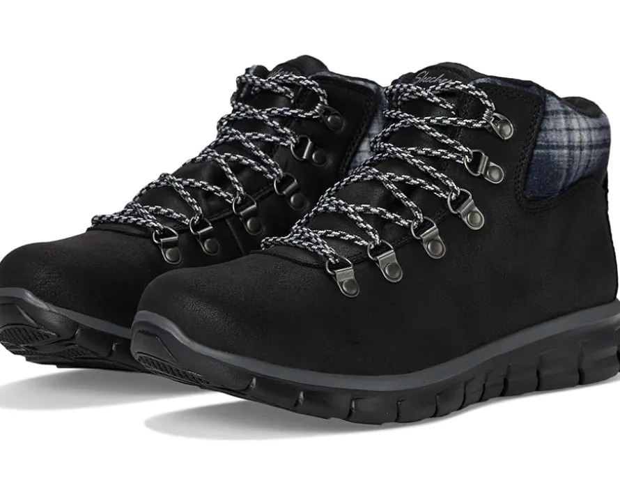 - Chilly weather style meets sporty comfort in the SKECHERS® Synergy – Plaid Mood. This lace-up hiker style boot features a water-repellent microleather fabric upper with a plaid knit trim, faux fur lining, cushioned Warm Tech Memory Foam insole, and a slip-resistant rubber traction outsole.