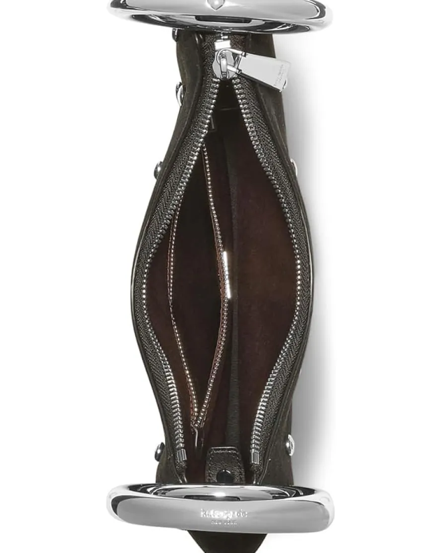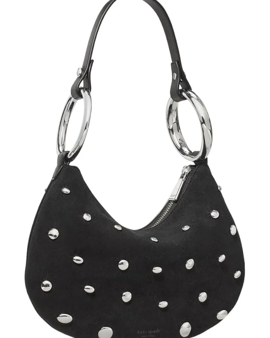 - Chic, edgy, and effortlessly glam: Kate Spade New York® The Bangle Studded Suede Bag. Crafted with supple leather and a smooth linen lining, this shoulder bag blends fashion-forward design with everyday practicality. Its roomy single compartment and two pockets keep essentials organized, while the zippered closure ensures everything stays secure. The exterior pops with gold foil “Love” text, perfectly complemented by brushed antique brass hardware, adding a vintage-chic charm to your ensemble.
