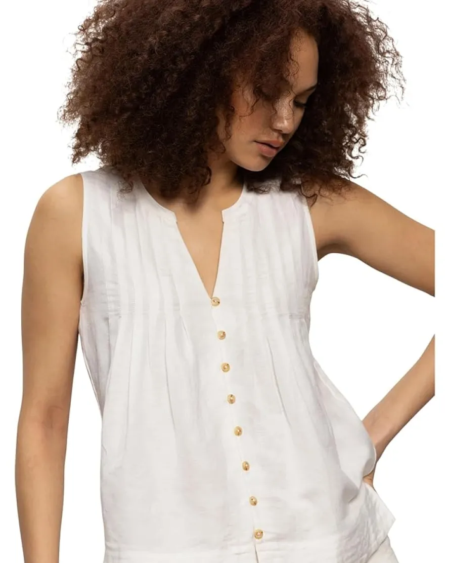 - Effortlessly chic and endlessly wearable – meet your new warm-weather go-to: the Sanctuary™ Harmony Tank. Designed with a modern classic fit, this sleeveless staple features a flattering V-neck and elegant pleat details at the chest that add subtle texture and visual interest. The button front design gives it a timeless twist, while the easy pull-on style keeps things comfy and carefree.