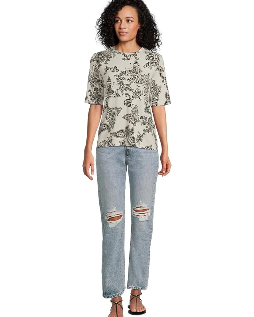- Effortlessly elegant, this tee features a delicate allover butterfly and floral print that brings a touch of nature-inspired charm. The silhouette and slightly extended short sleeves offer a polished, modern look, while the soft fabric ensures all-day comfort. Perfect for dressing up with trousers or keeping it casual with denim.