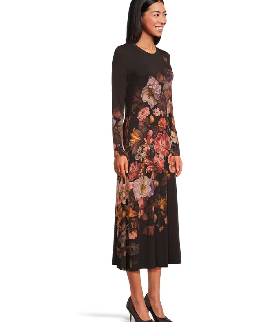 - Elegant and effortlessly romantic, this long-sleeve midi dress blooms with rich, painterly florals against a deep, dramatic background. Its soft drape and timeless silhouette make it perfect for transitioning from day to evening with ease and sophistication.